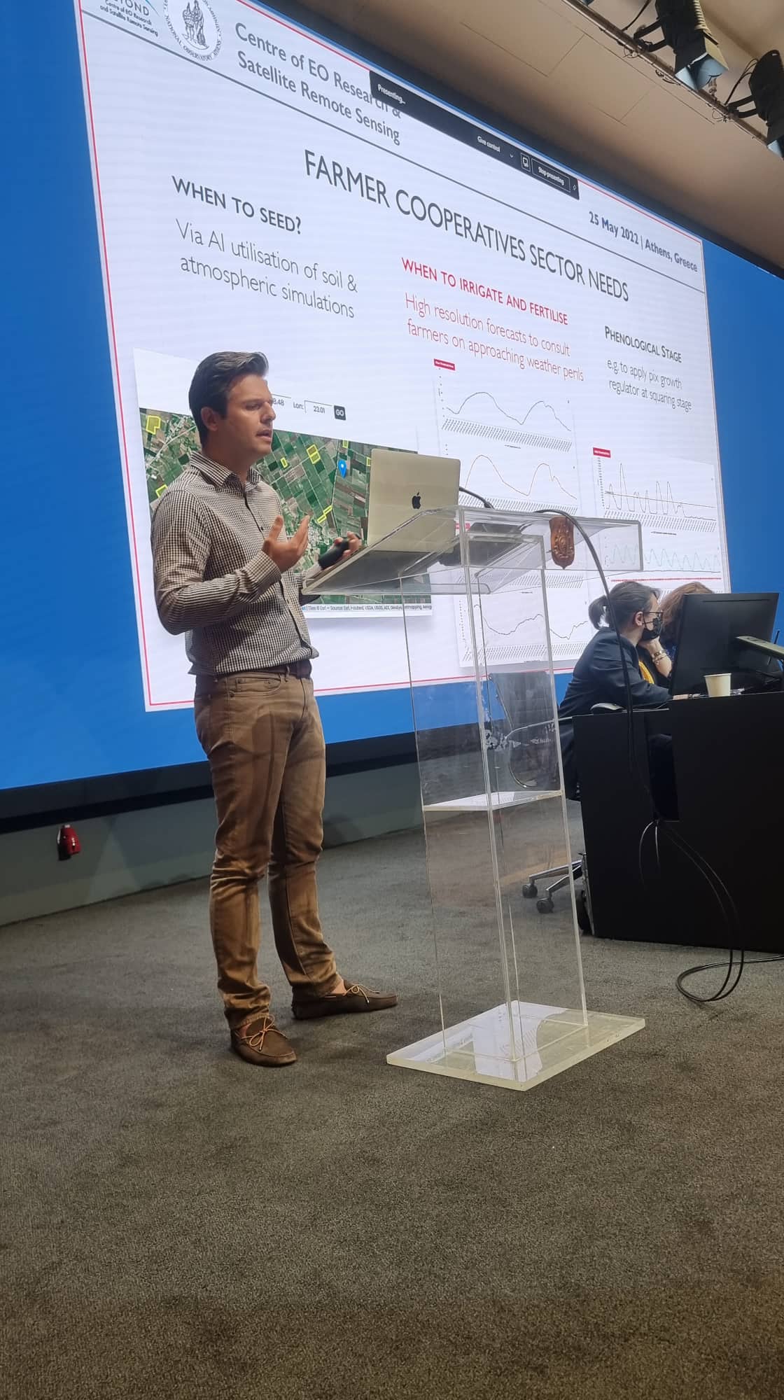Στη συνέχεια, ο μεταδιδακτορικός ερευνητής στο BEYOND Νικόλαος Μπαρτσώτας , στο πλαίσιο του πρώτου panel με θέμα το πως τα δορυφορικά δεδομένα μπορούν να συμβάλλουν στην πρόληψη, στην ετοιμότητα , στην αντιμετώπιση και στην αποκατάσταση μετά από μια φυσική καταστροφή, επεσήμανε την ουσιώδη εμπλοκή φορέων & χρηστών στη συνδιαμόρφωση υπηρεσιών γεωργίας ακριβείας & πως η προσέγγιση αυτή εξασφαλίζει την μελλοντική αξιοποίησή τους από φορείς καθώς & την περαιτέρω βιωσιμότητα τους.