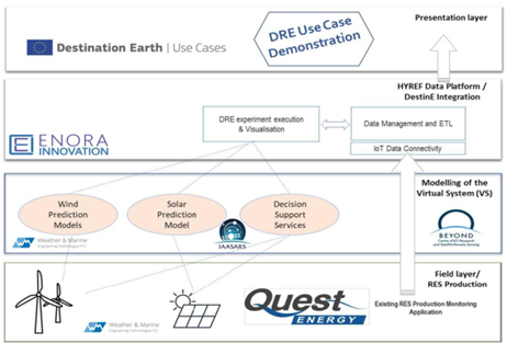 The main objective of the Destination Renewable Energy (DRE) Use Case is to develop the Hybrid Renewable Energy Forecasting System (HYREF), a hybrid (solar and wind) application that could provide renewable energy forecasts in different time scales. HYREF will act as a decision support system, aiming at maximising the use of DESP data and tools to provide actionable and meaningful information for policy and decision making in support of the green and digital transformation, using applications in the field of energy and climate change. The application will be developed and include a demonstration of end-user portfolio benefits optimization, based on existing or planned solar and wind energy infrastructure. Furthermore, the final application will provide spatial upscaling options based on the DESP data coverage.
